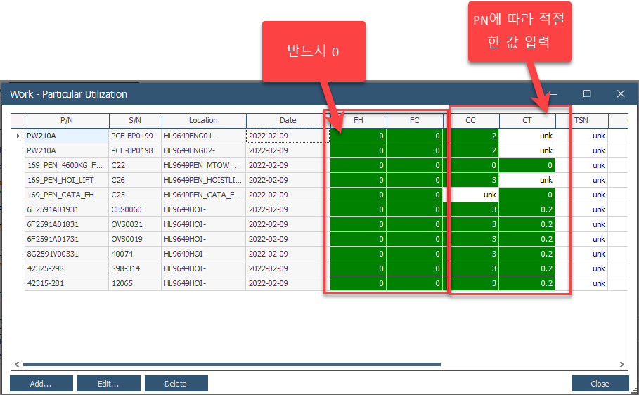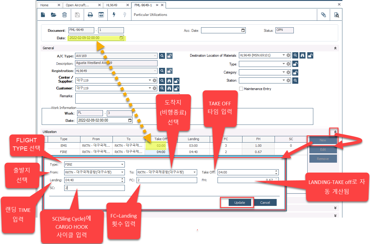 기본적으로 ENGINE, HOIST, APU 등 장착 부품에 고유한 시간(APU Time, Hoist 시간 등) 및 사이클(GG Cycle, PT Cycle 등)을 입력하기 위한 목적임