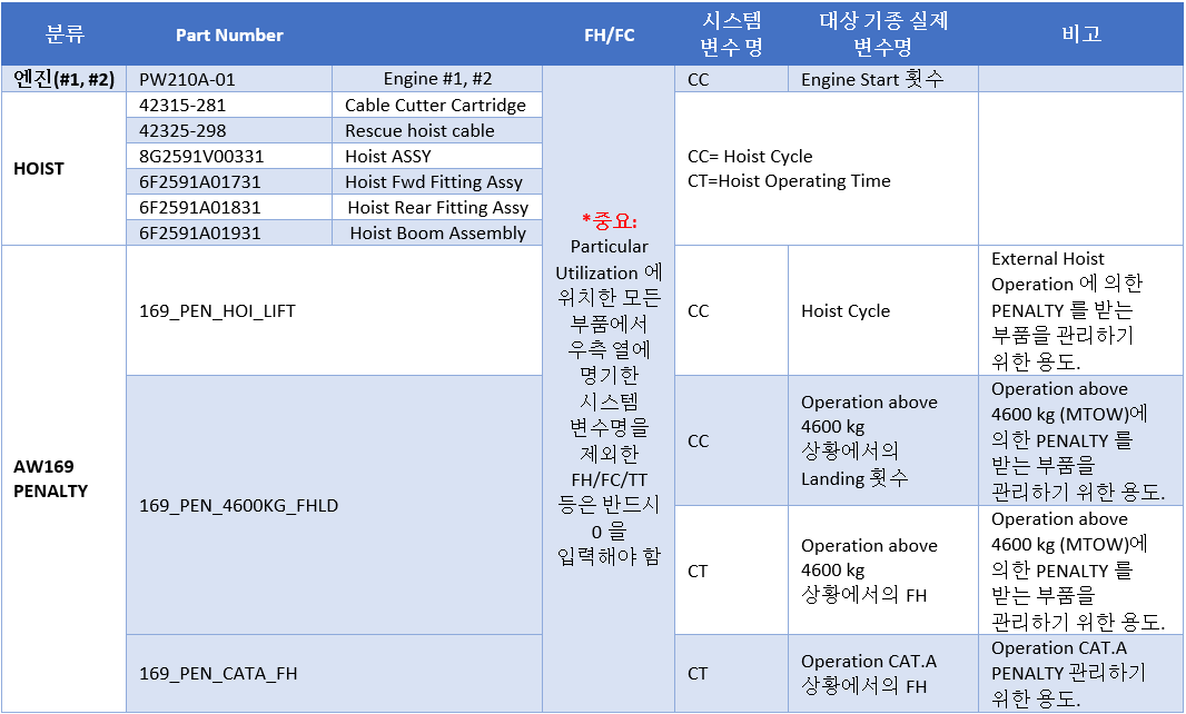 장착 부품의 Part Number에 따라서 아래 맵핑 테이블을 참고하여 Counter 섹션에 적절한 값을 입력해야 하며, Step4에서와 같이 하나의 FML에 여러 비행기록이 있더라도, PARTICULAR UTILIZATION에서는 합산해서 하나로 기록하여야 함