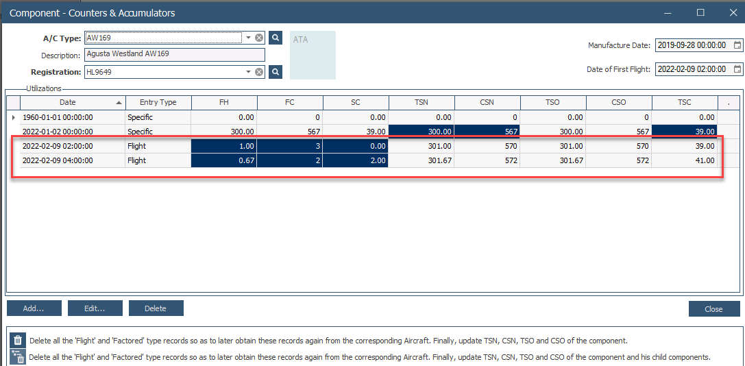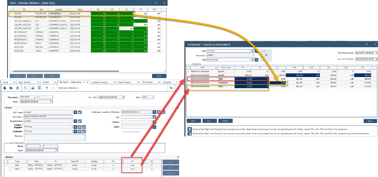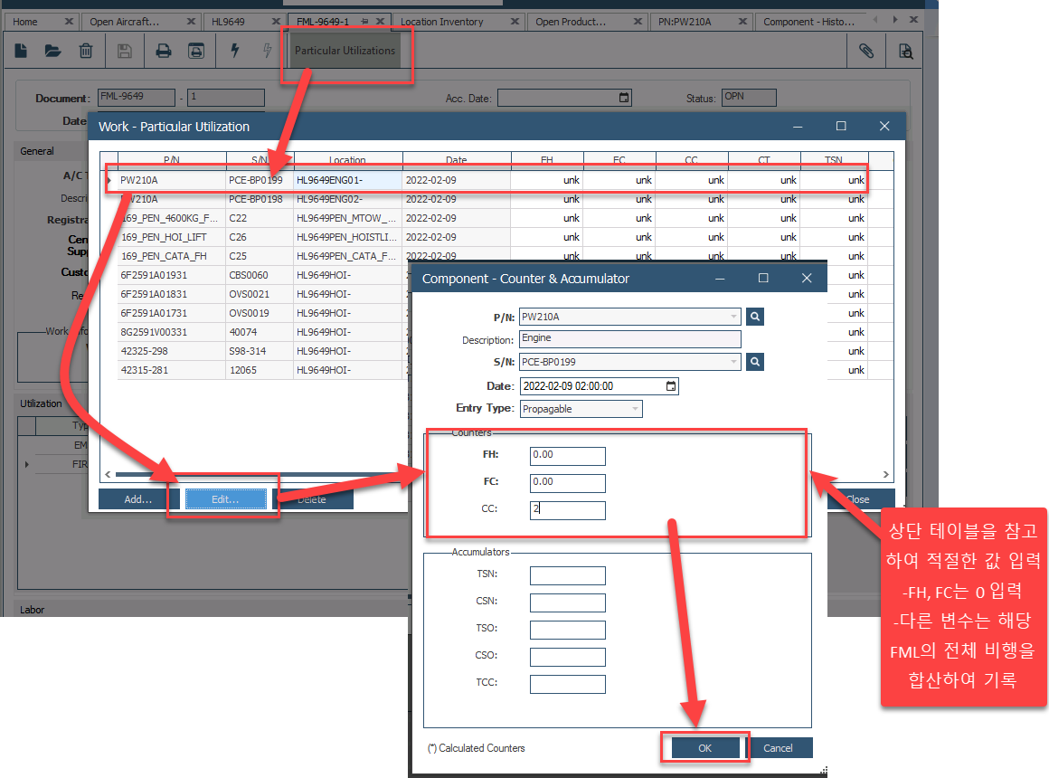 주로, 시스템에서 자동으로 실행되는 System Process에 의해서 CLOSING 된 FML의 UTILIZATION VALUE(FH, FC 등) 가 개별 항공기나 장착 부품에 저장됨. 하지만, 아래 이미지의 방법을 따를 경우, System Process가 자동으로 실행되기 전에도 직접 저장 가능하니 참고 바람