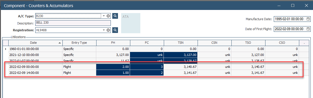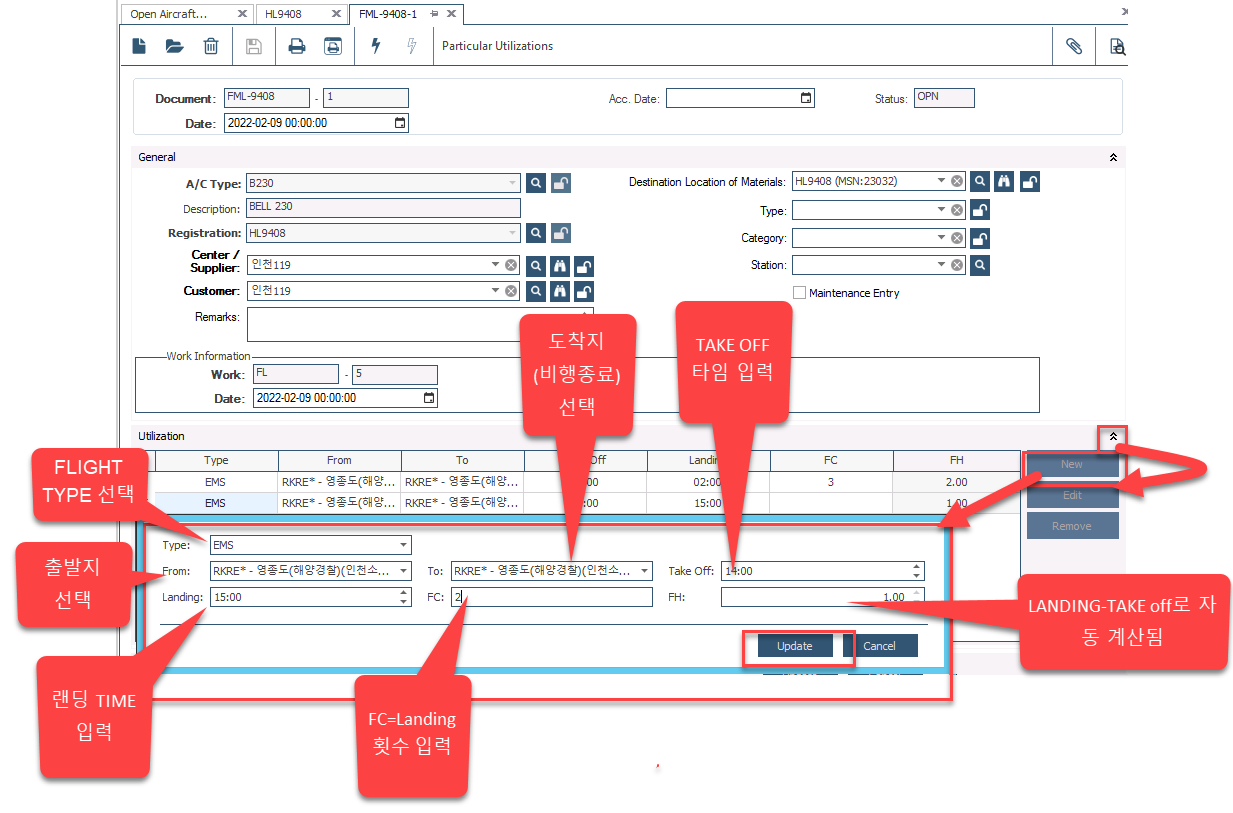 주로, 시스템에서 자동으로 실행되는 System Process에 의해서 CLOSING 된 FML의 UTILIZATION VALUE(FH, FC 등) 가 개별 항공기나 장착 부품에 저장됨. 하지만, 아래 이미지의 방법을 따를 경우, System Process가 자동으로 실행되기 전에도 직접 저장 가능하니 참고 바람