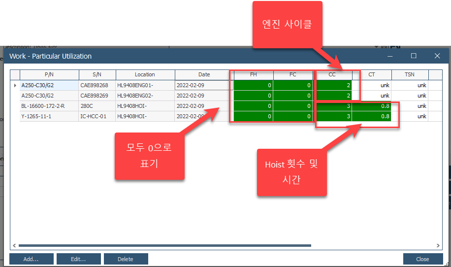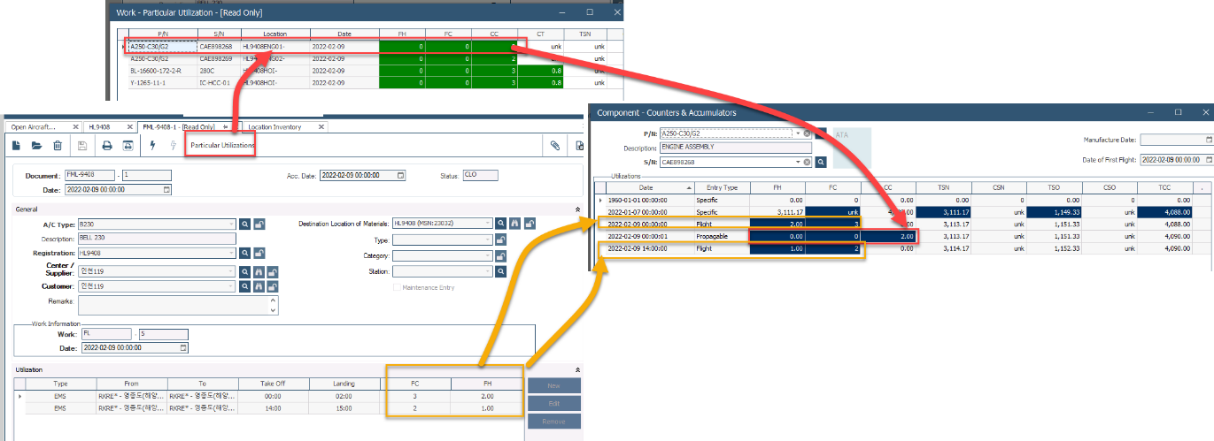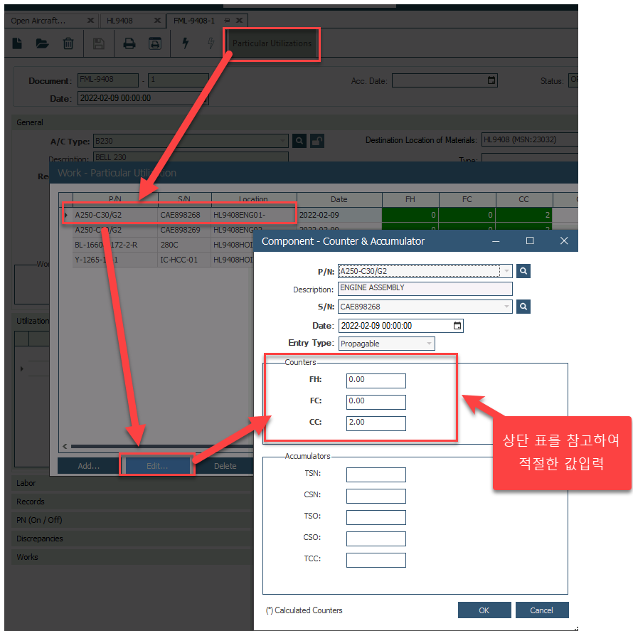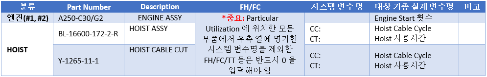 기본적으로 ENGINE, HOIST, APU 등 장착 부품에 고유한 시간(APU Time, Hoist 시간 등) 및 사이클(GG Cycle, PT Cycle 등)을 입력하기 위한 목적임 장착 부품의 Part Number에 따라서 아래 맵핑 테이블을 참고하여 Counter 섹션에 적절한 값을 입력해야 하며, Step4에서와 같이 하나의 FML에 여러 비행기록이 있더라도, PARTICULAR UTILIZATION에서는 합산해서 하나로 기록하여야 함