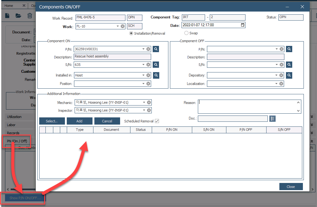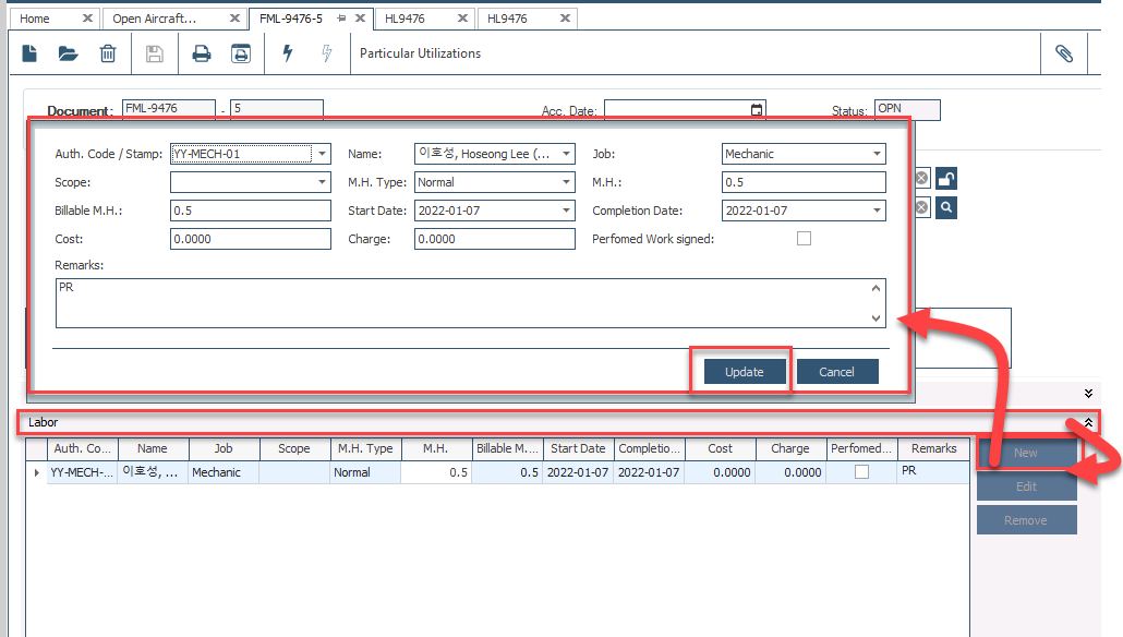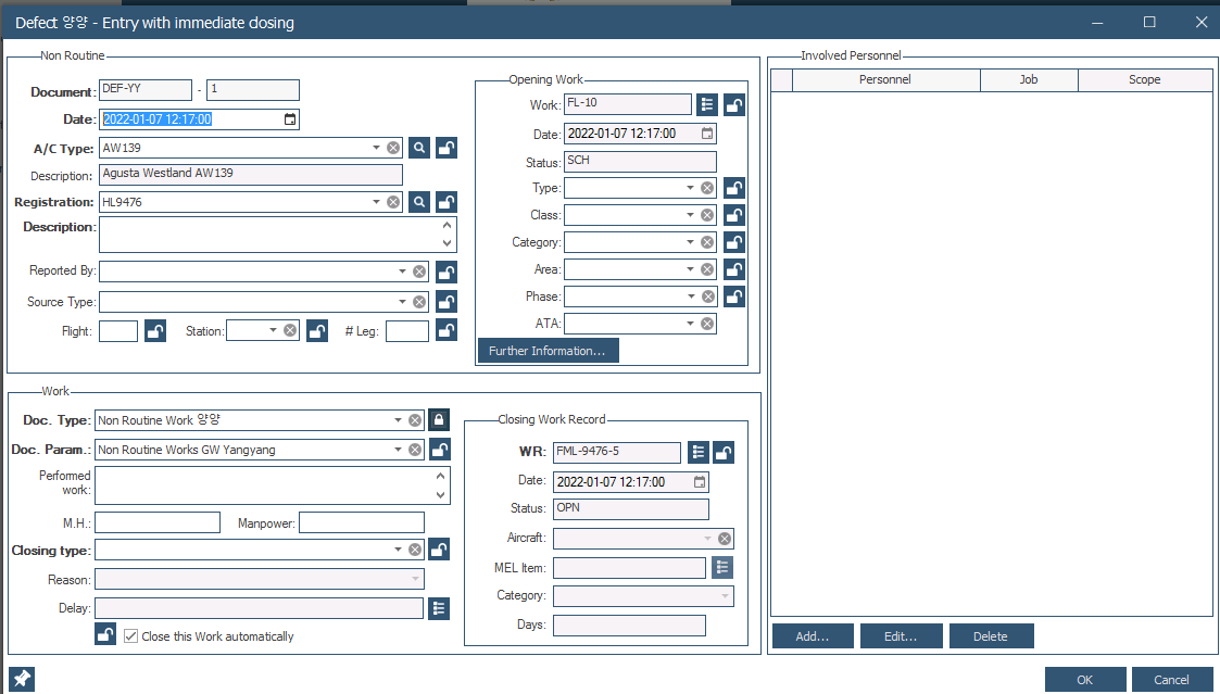 “Works” → “Work Records”→”New”→”FLIGHT &MAINT LOG”를 클릭하면 팝업 창에 생성됨. 팝업 창에서 대상 항공기 기번(HL0000)에 맞는 “Document Parameter”선택” 후, “OK”버튼 클릭