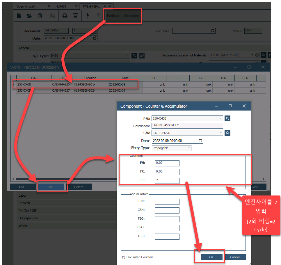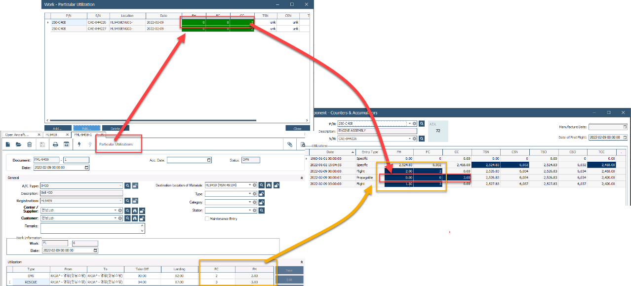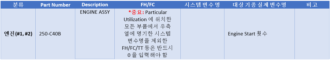 기본적으로 ENGINE, HOIST, APU 등 장착 부품에 고유한 시간(APU Time, Hoist 시간 등) 및 사이클(GG Cycle, PT Cycle 등)을 입력하기 위한 목적임 장착 부품의 Part Number에 따라서 아래 맵핑 테이블을 참고하여 Counter 섹션에 적절한 값을 입력해야 하며, Step4에서와 같이 하나의 FML에 여러 비행기록이 있더라도, PARTICULAR UTILIZATION에서는 합산해서 하나로 기록하여야 함