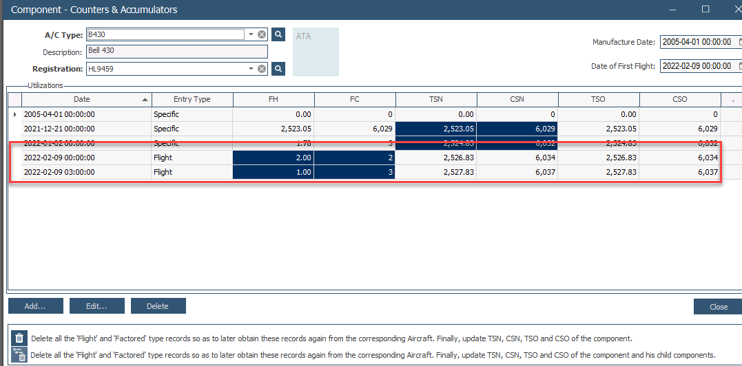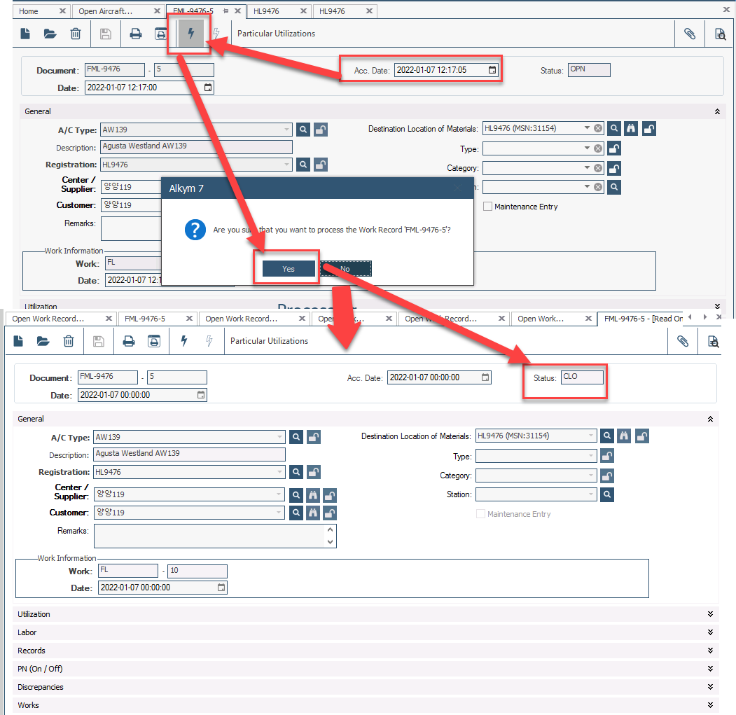 주로, 시스템에서 자동으로 실행되는 System Process에 의해서 CLOSING 된 FML의 UTILIZATION VALUE(FH, FC 등) 가 개별 항공기나 장착 부품에 저장됨. 하지만, 아래 이미지의 방법을 따를 경우, System Process가 자동으로 실행되기 전에도 직접 저장 가능하니 참고 바람