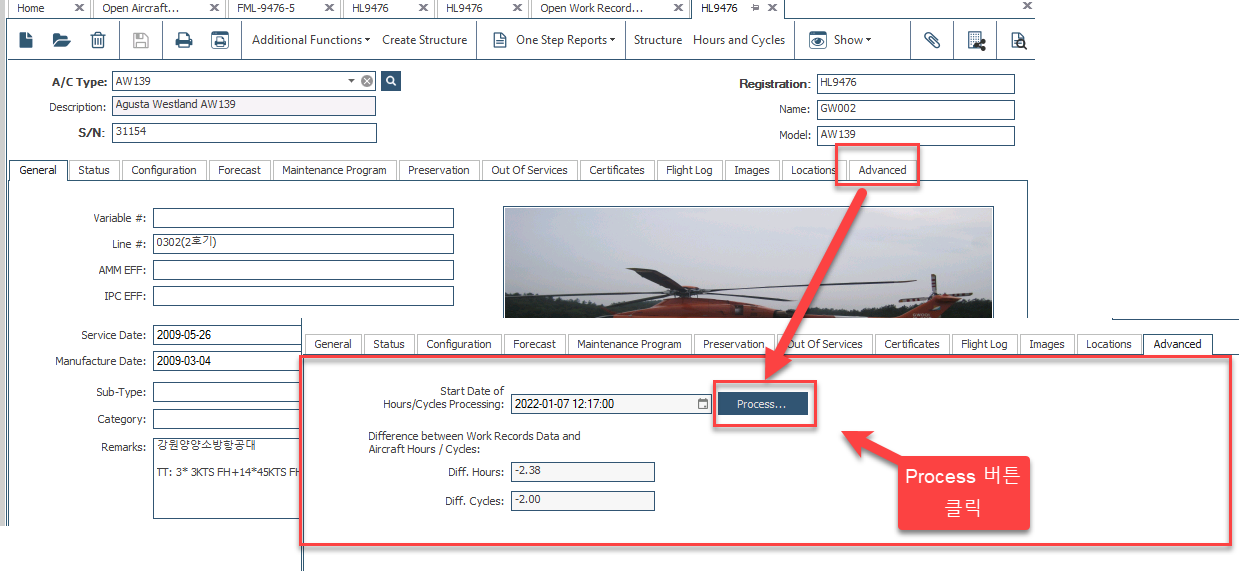 “Works” → “Work Records”→”New”→”FLIGHT &MAINT LOG”를 클릭하면 팝업 창에 생성됨. 팝업 창에서 대상 항공기 기번(HL0000)에 맞는 “Document Parameter”선택” 후, “OK”버튼 클릭