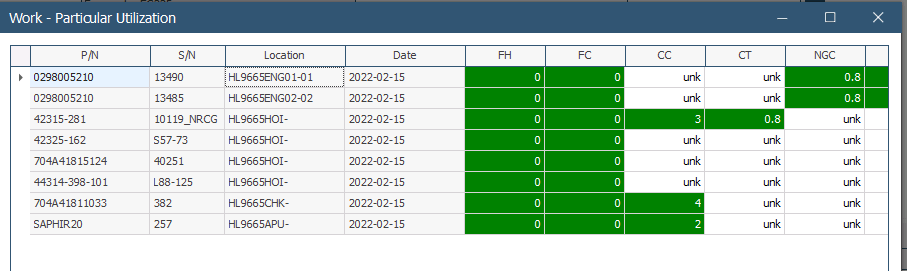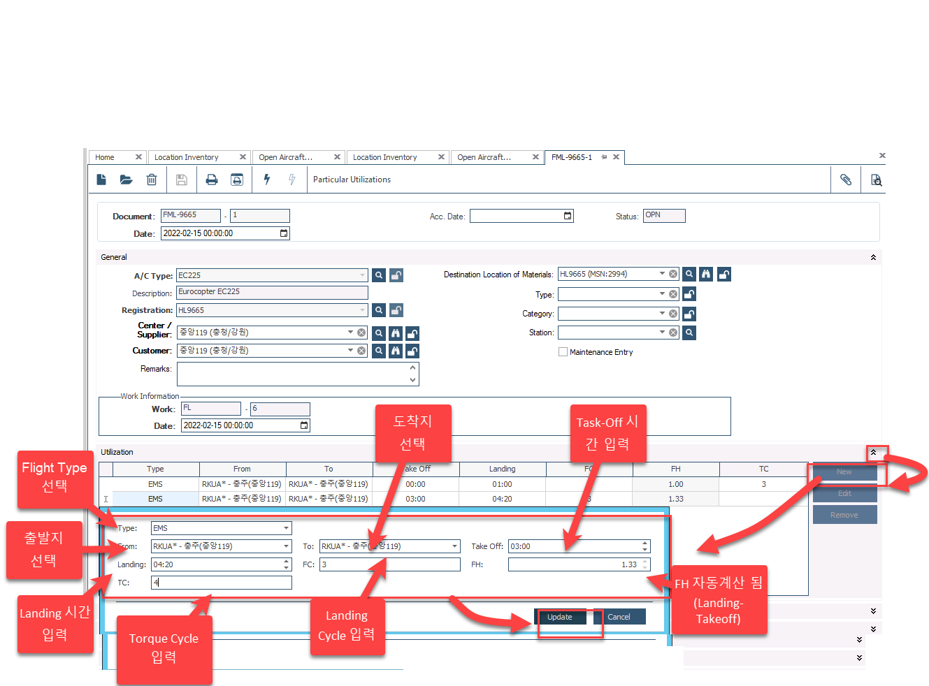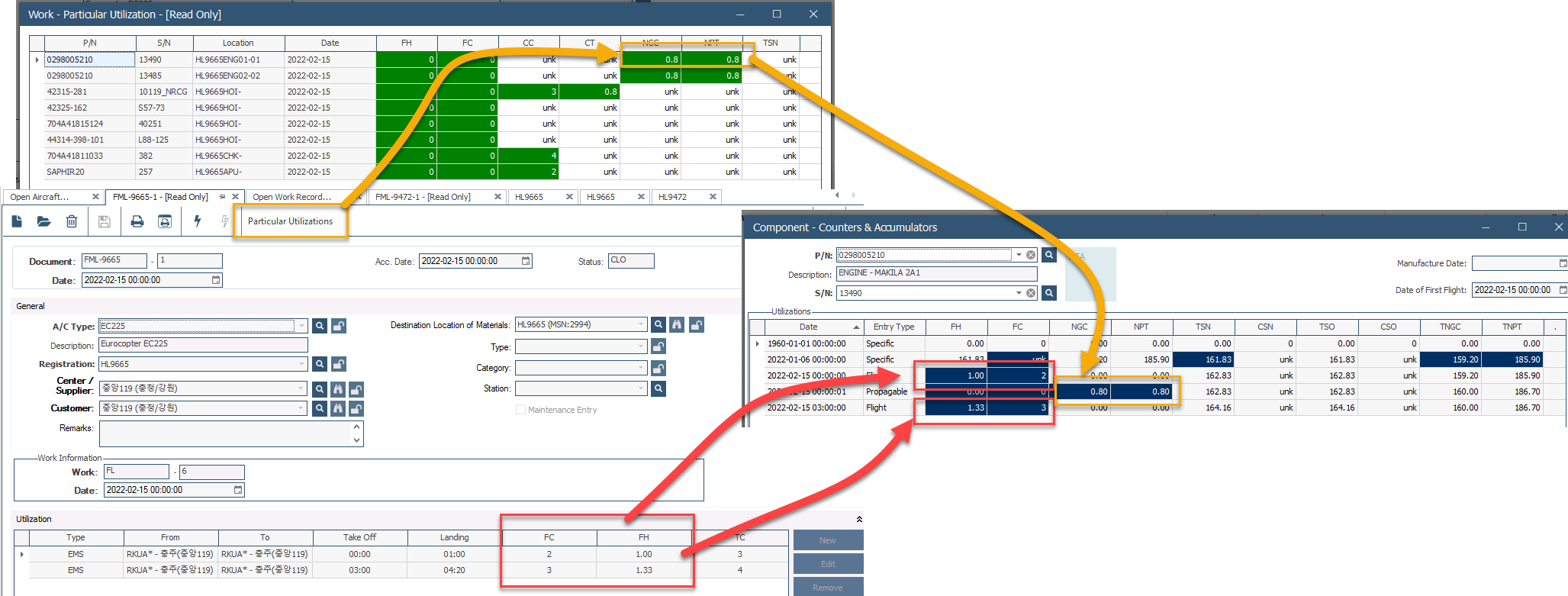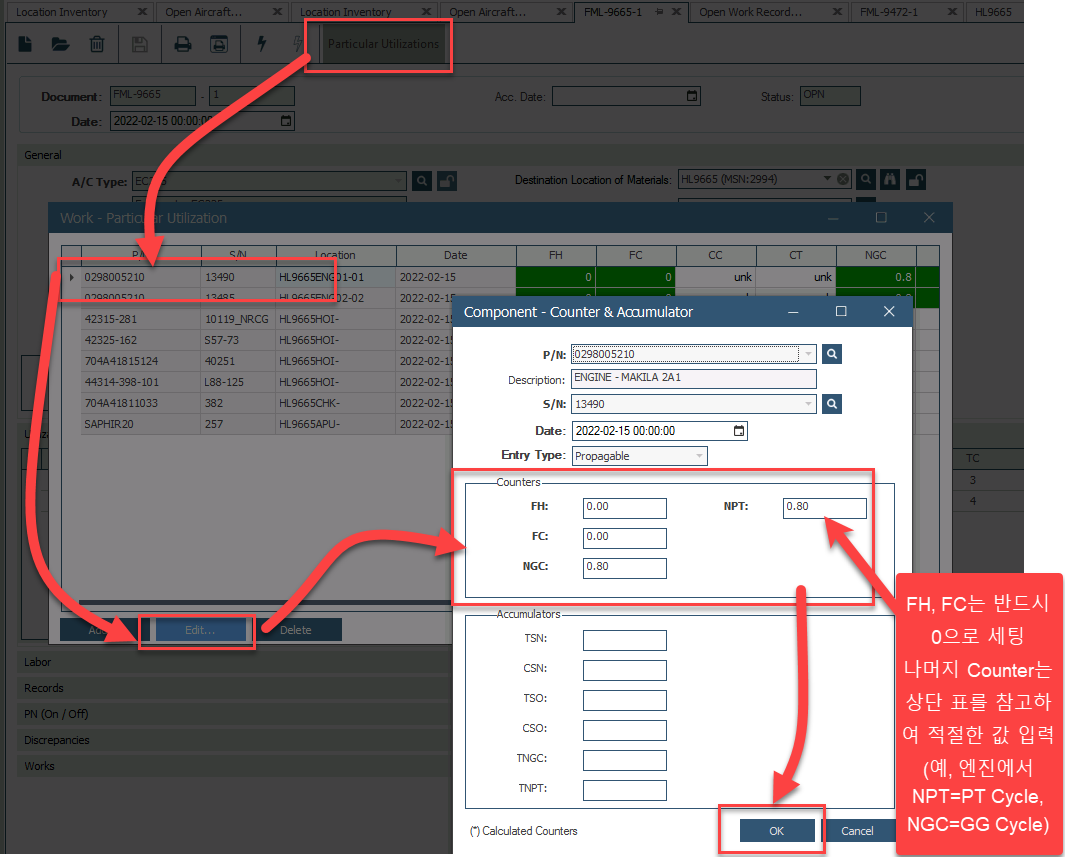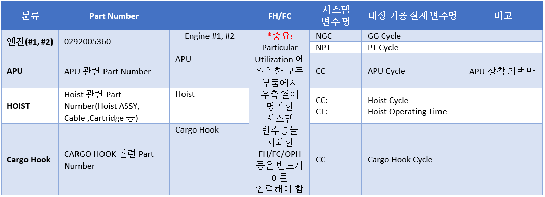 기본적으로 ENGINE, HOIST, APU 등 장착 부품에 고유한 시간(APU Time, Hoist 시간 등) 및 사이클(GG Cycle, PT Cycle 등)을 입력하기 위한 목적임 장착 부품의 Part Number에 따라서 아래 맵핑 테이블을 참고하여 Counter 섹션에 적절한 값을 입력해야 하며, Step4에서와 같이 하나의 FML에 여러 비행기록이 있더라도, PARTICULAR UTILIZATION에서는 합산해서 하나로 기록하여야 함