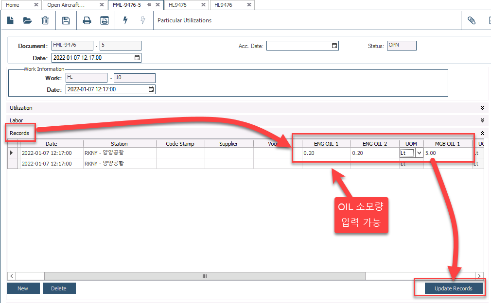 “Works” → “Work Records”→”New”→”FLIGHT &MAINT LOG”를 클릭하면 팝업 창에 생성됨. 팝업 창에서 대상 항공기 기번(HL0000)에 맞는 “Document Parameter”선택” 후, “OK”버튼 클릭