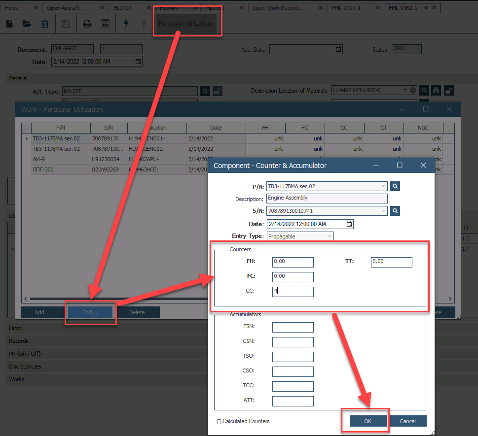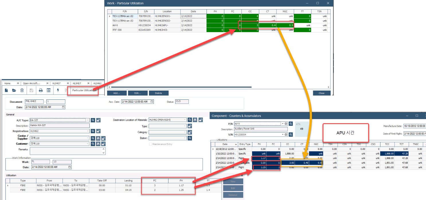 기본적으로 ENGINE, HOIST, APU 등 장착 부품에 고유한 시간(APU Time, Hoist 시간 등) 및 사이클(GG Cycle, PT Cycle 등)을 입력하기 위한 목적임 장착 부품의 Part Number에 따라서 아래 맵핑 테이블을 참고하여 Counter 섹션에 적절한 값을 입력해야 하며, Step4에서와 같이 하나의 FML에 여러 비행기록이 있더라도, PARTICULAR UTILIZATION에서는 합산해서 하나로 기록하여야 함