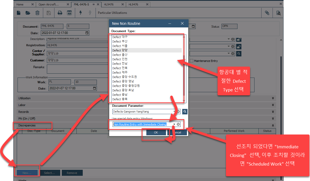 “Works” → “Work Records”→”New”→”FLIGHT &MAINT LOG”를 클릭하면 팝업 창에 생성됨. 팝업 창에서 대상 항공기 기번(HL0000)에 맞는 “Document Parameter”선택” 후, “OK”버튼 클릭