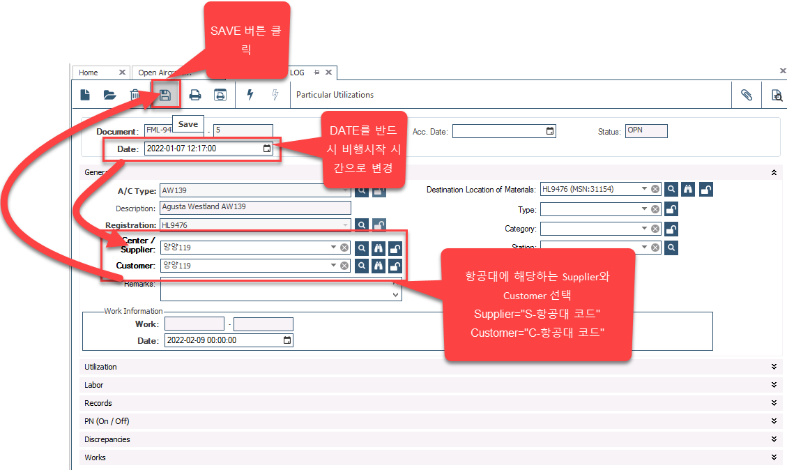FML 생성시점(DATE)은 반드시 비행 시점과 동일하게 변경하는 것을 권장함. 이 후, 항공대에 해당하는 Supplier(S-항공대코드)/Customer(C-항공대 코드) 코드 선택 후 Save 버튼 클릭