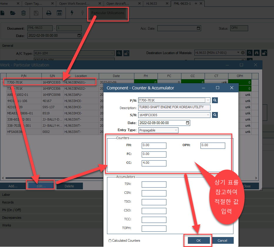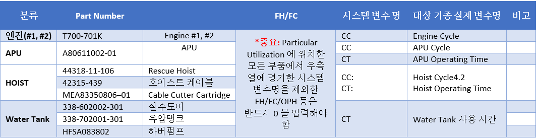 기본적으로 ENGINE, HOIST, APU 등 장착 부품에 고유한 시간(APU Time, Hoist 시간 등) 및 사이클(GG Cycle, PT Cycle 등)을 입력하기 위한 목적임 장착 부품의 Part Number에 따라서 아래 맵핑 테이블을 참고하여 Counter 섹션에 적절한 값을 입력해야 하며, Step4에서와 같이 하나의 FML에 여러 비행기록이 있더라도, PARTICULAR UTILIZATION에서는 합산해서 하나로 기록하여야 함