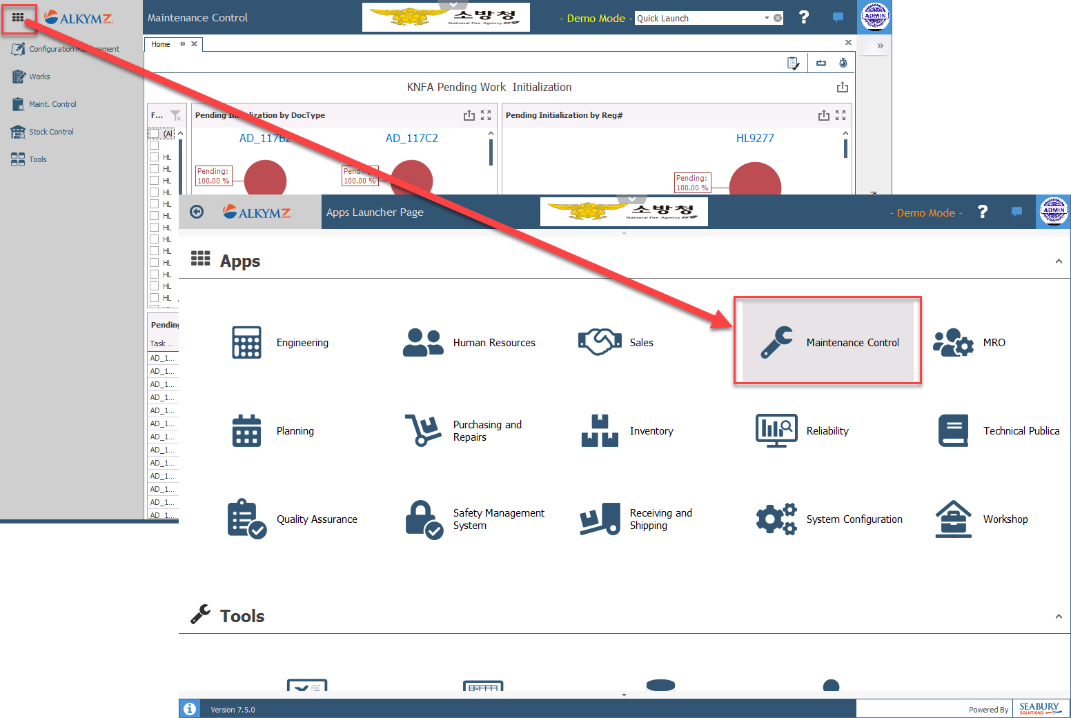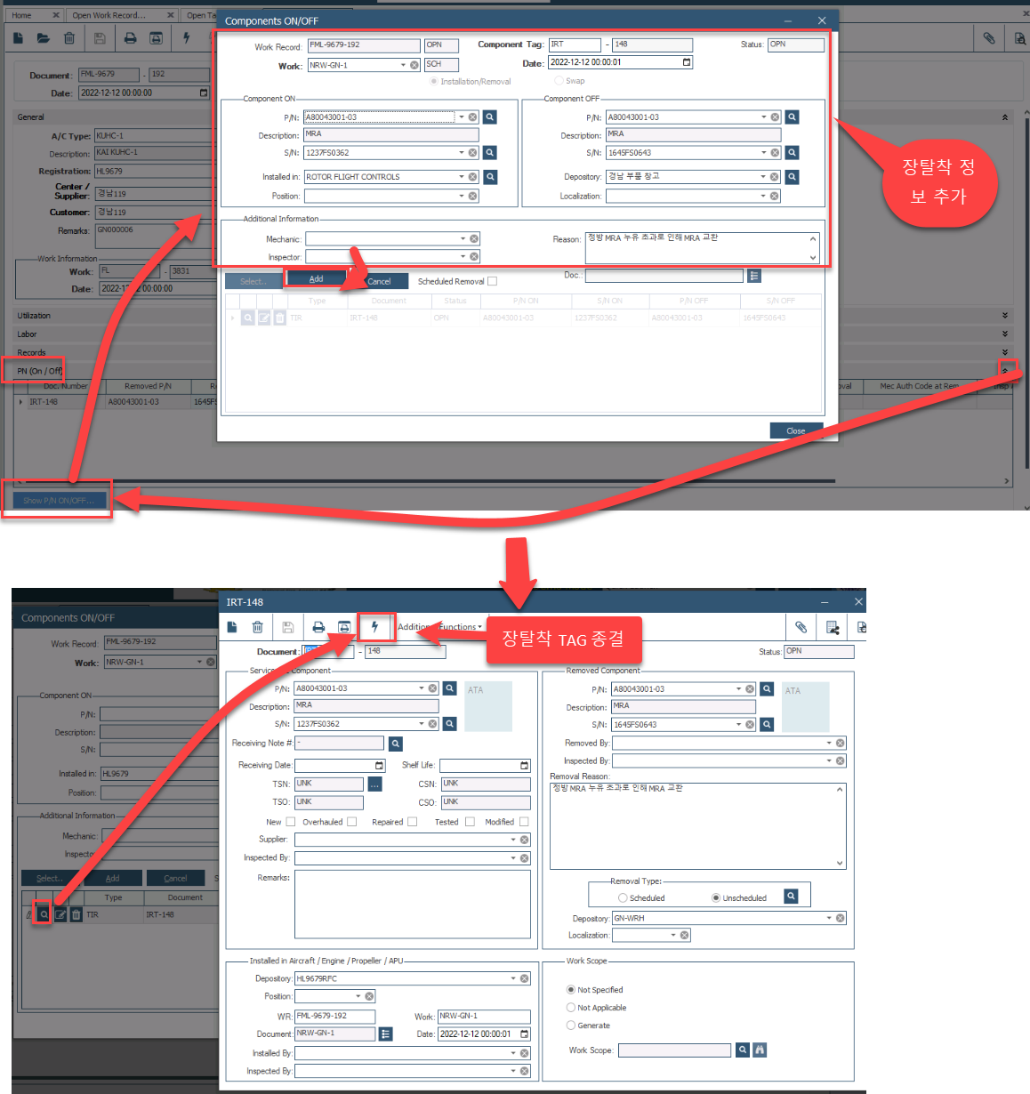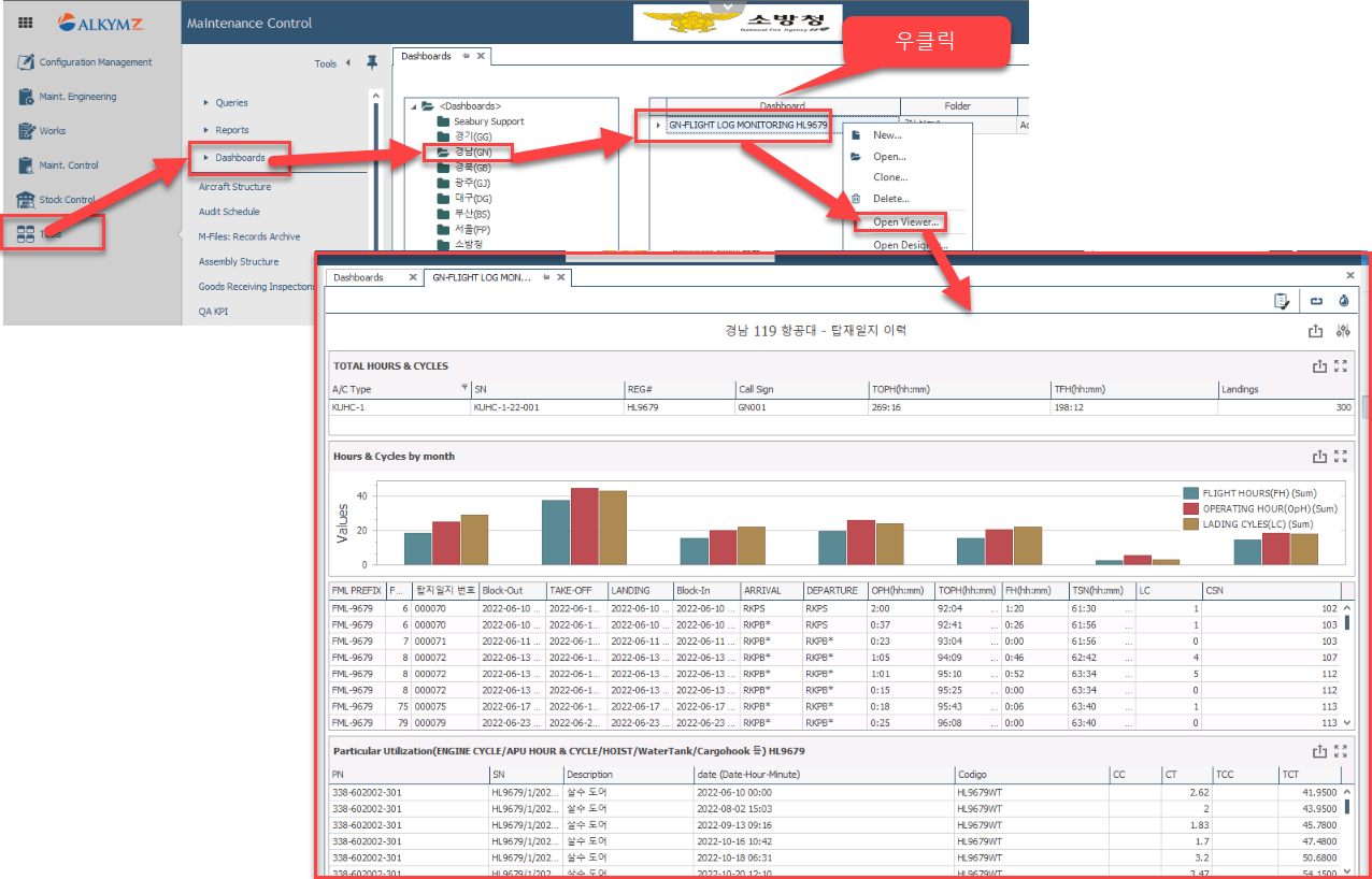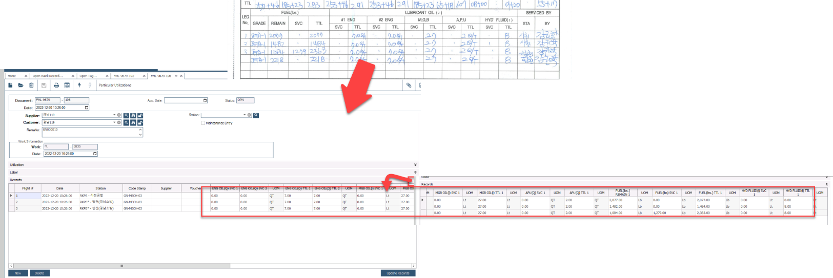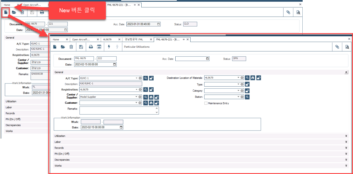 “Works” → “Work Records”→”New”→”FLIGHT &MAINT LOG”를 클릭하면 팝업 창에 생성됨. 팝업 창에서 대상 항공기 기번(HL0000)에 맞는 “Document Parameter”선택” 후, “OK”버튼 클릭