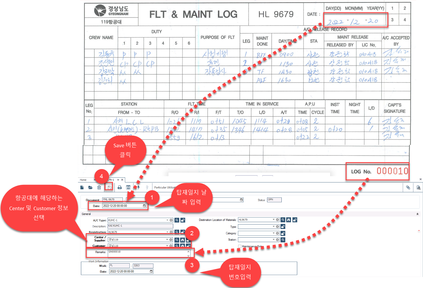 ① 탑재일지 일자 입력: 탑재일지 비행일자와 동일하게 입력