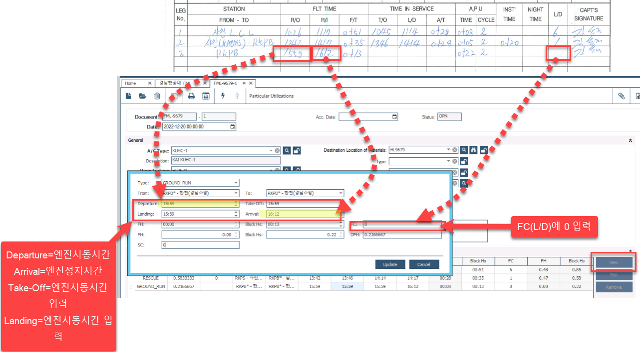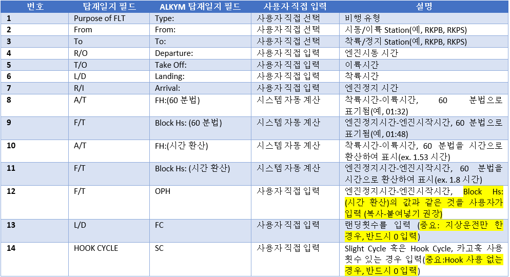 기본적인 방법은 위 비행시간 입력과 같으나 차이점은 아래와 같음