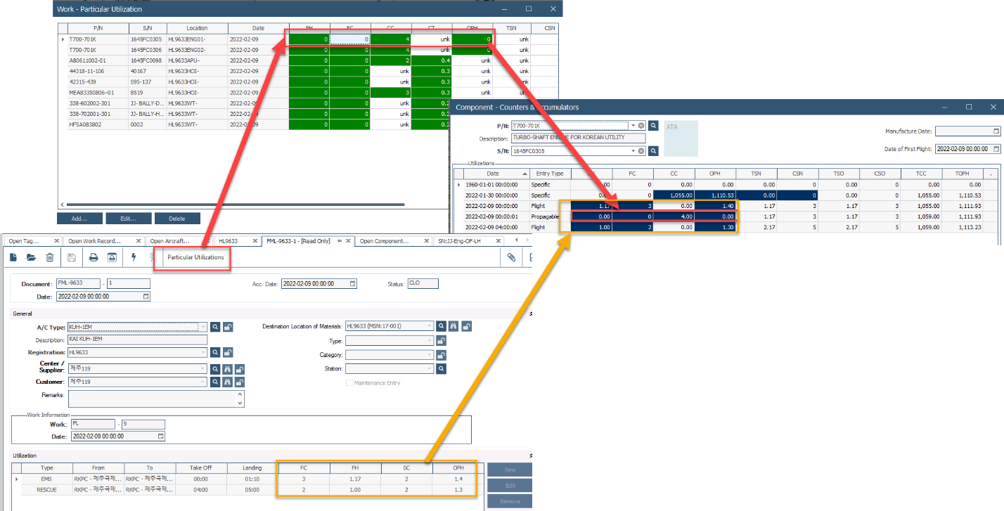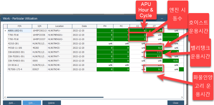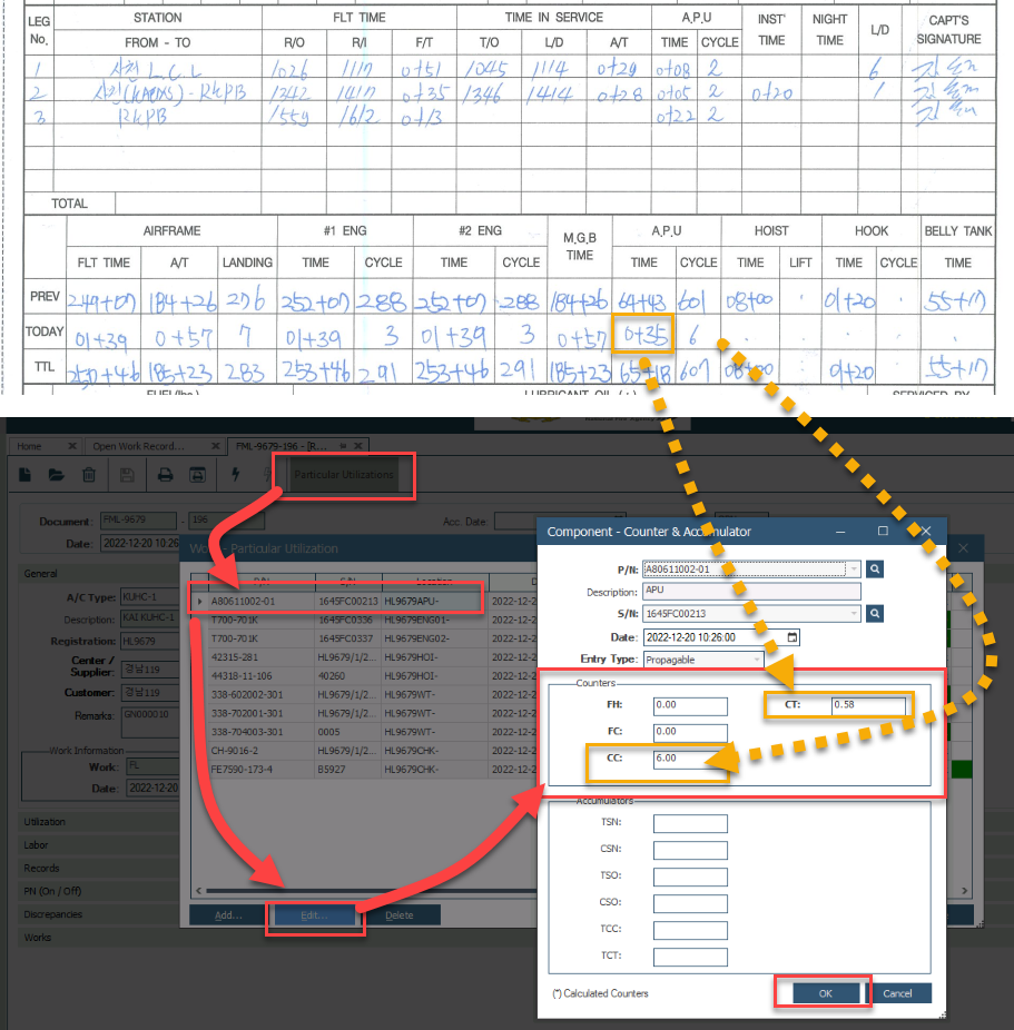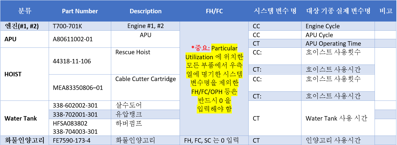 기본적으로 ENGINE, HOIST, APU 등 장착 부품에 고유한 시간(APU Time, Hoist 시간 등) 및 사이클(GG Cycle, PT Cycle 등)을 입력하기 위한 목적임 장착 부품의 Part Number에 따라서 아래 맵핑 테이블을 참고하여 Counter 섹션에 적절한 값을 입력해야 하며, Step4에서와 같이 하나의 FML에 여러 비행기록이 있더라도, PARTICULAR UTILIZATION에서는 합산해서 하나로 기록하여야 함