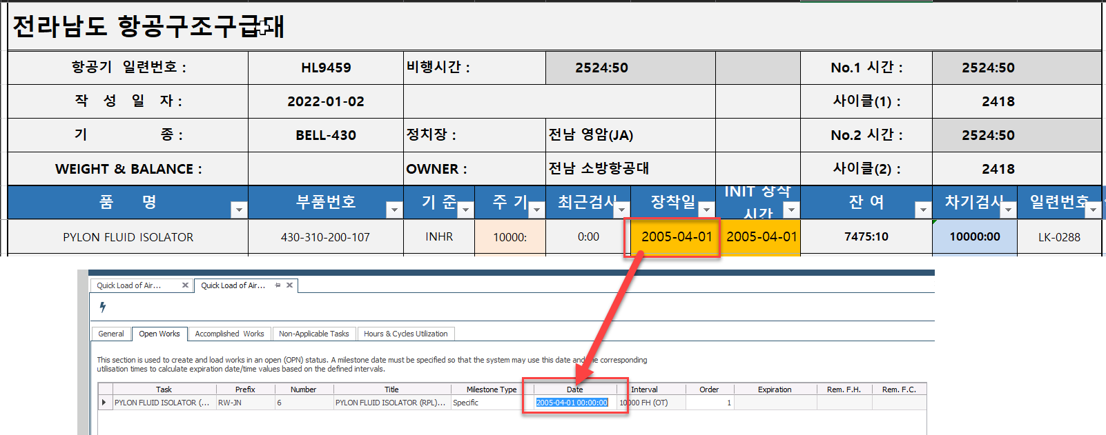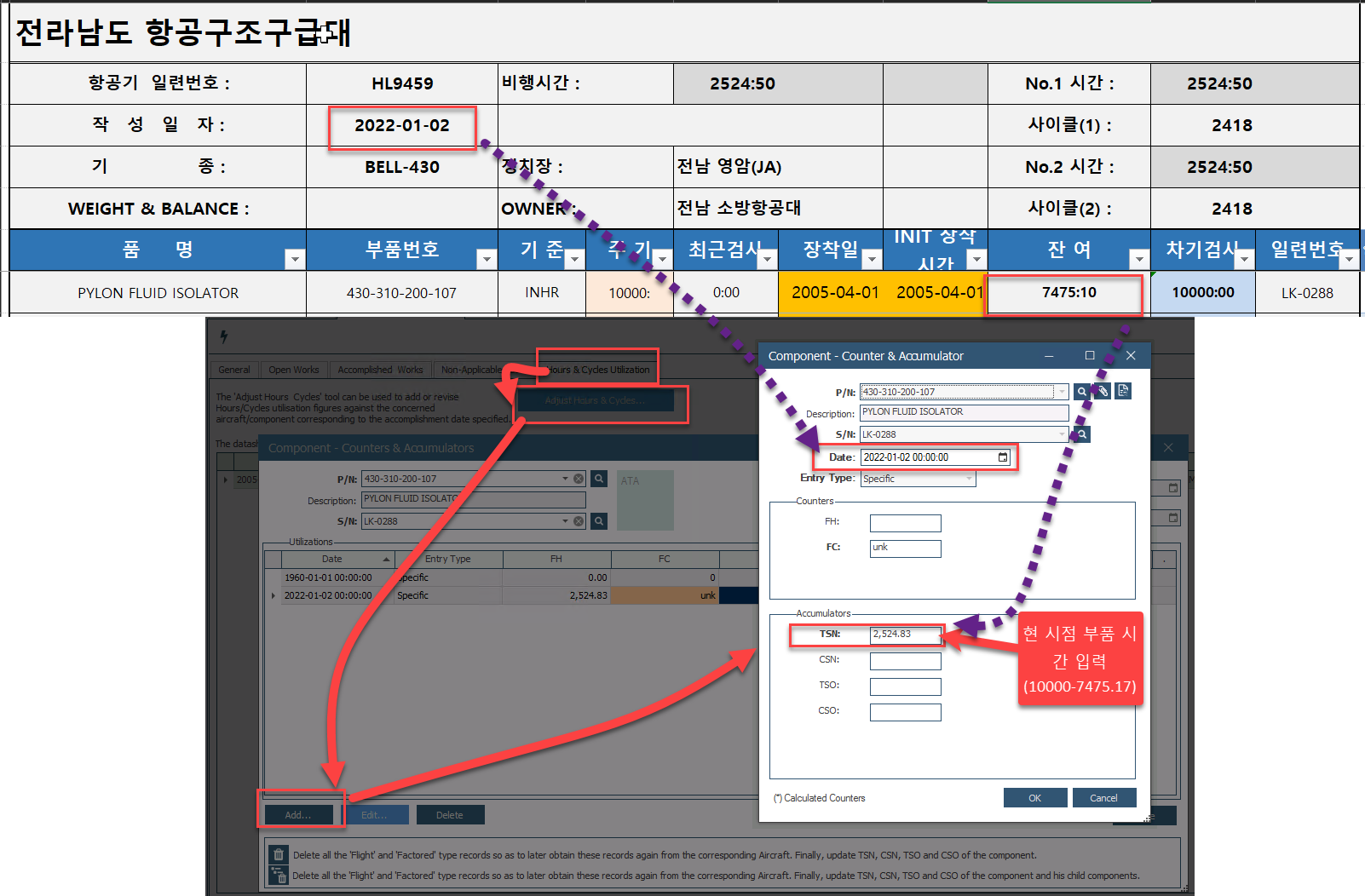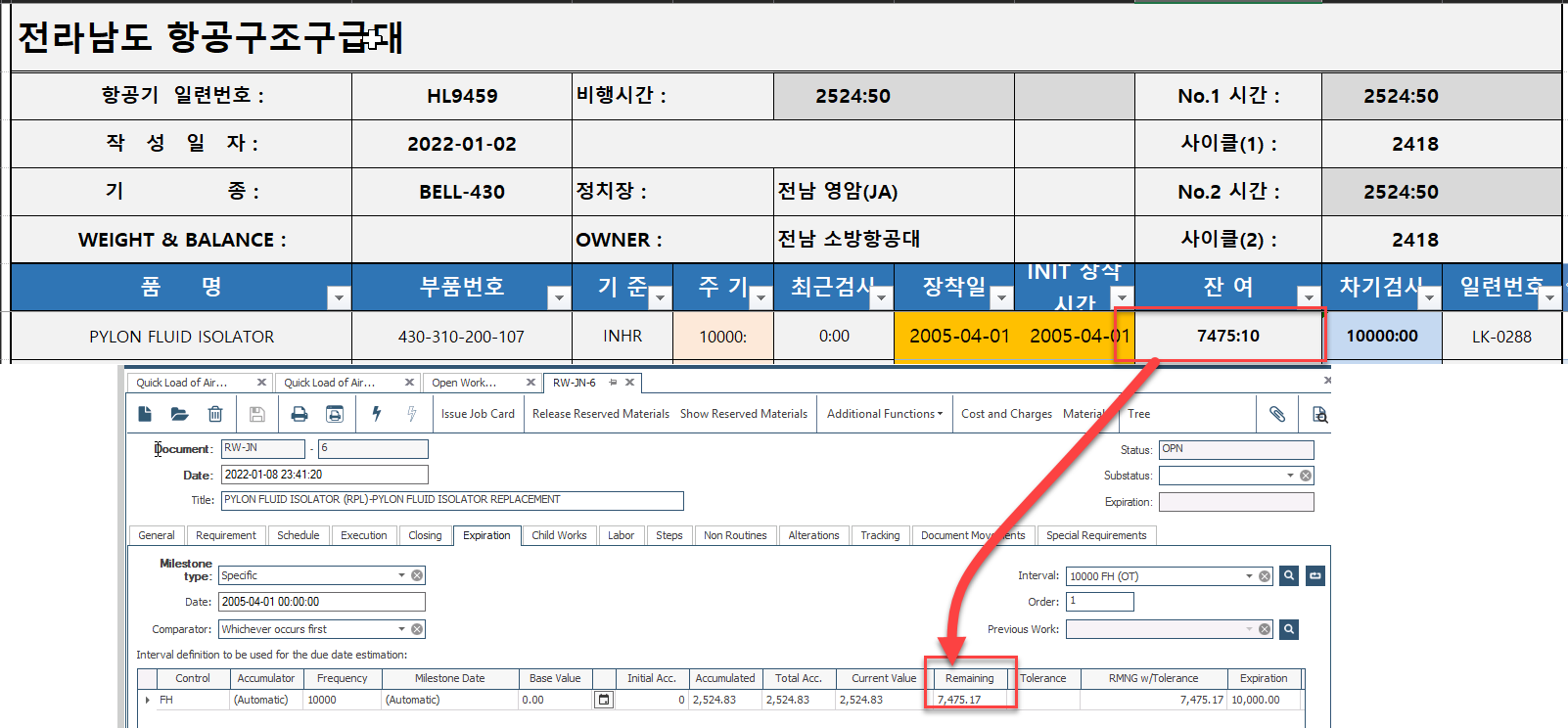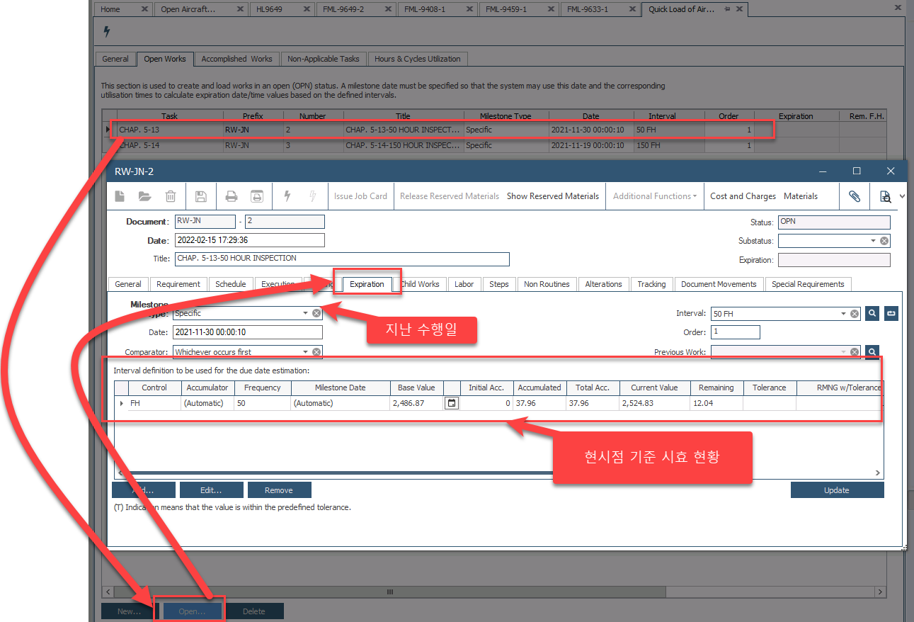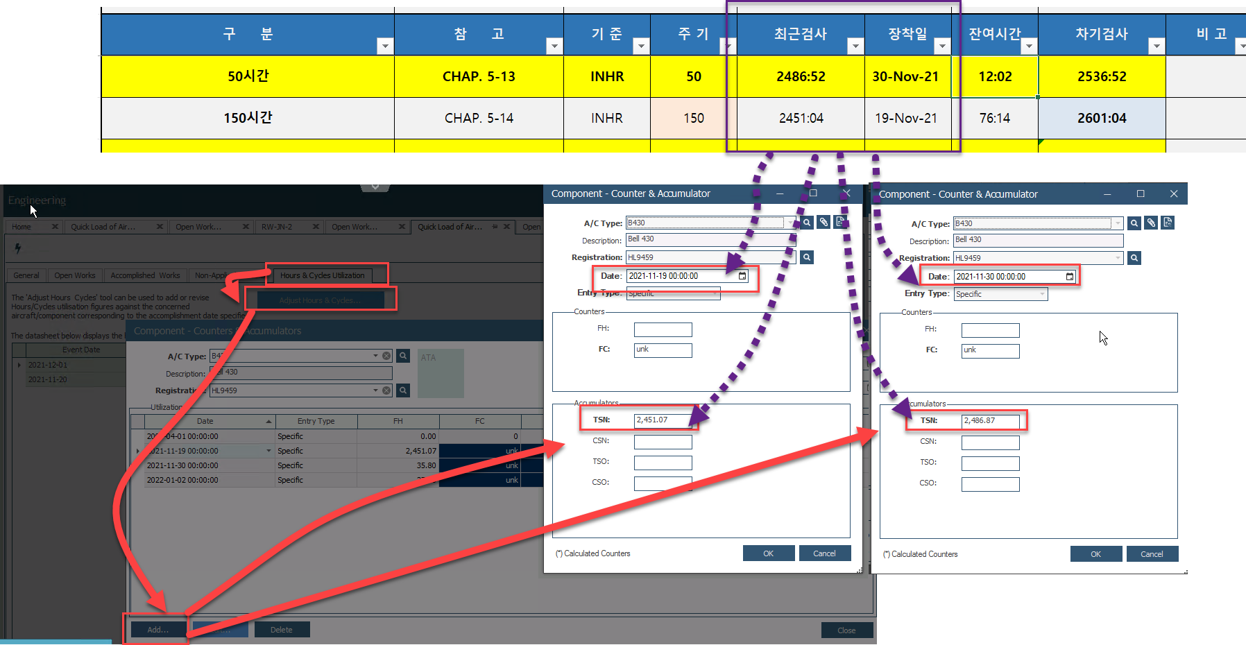● 반복성 Task(Inspection, TBO)의 경우, 지난 수행일 및 해당 수행 시점의 항공기 및 부품 시간 및 사이클 정보 입력