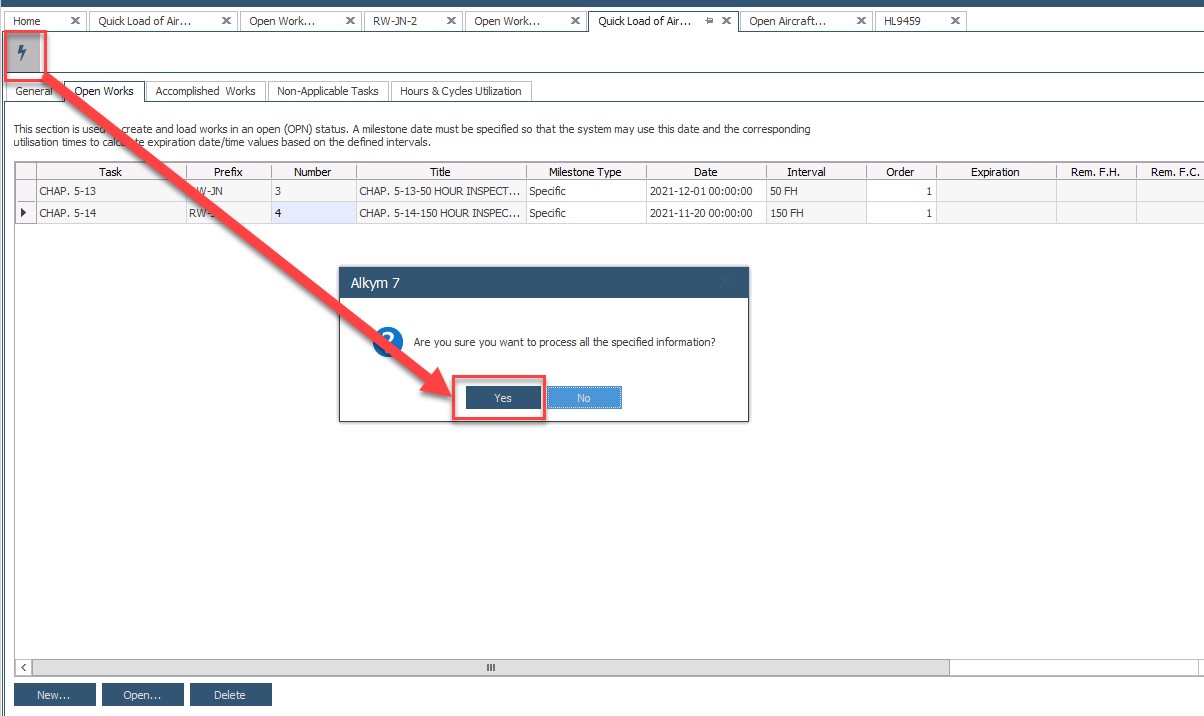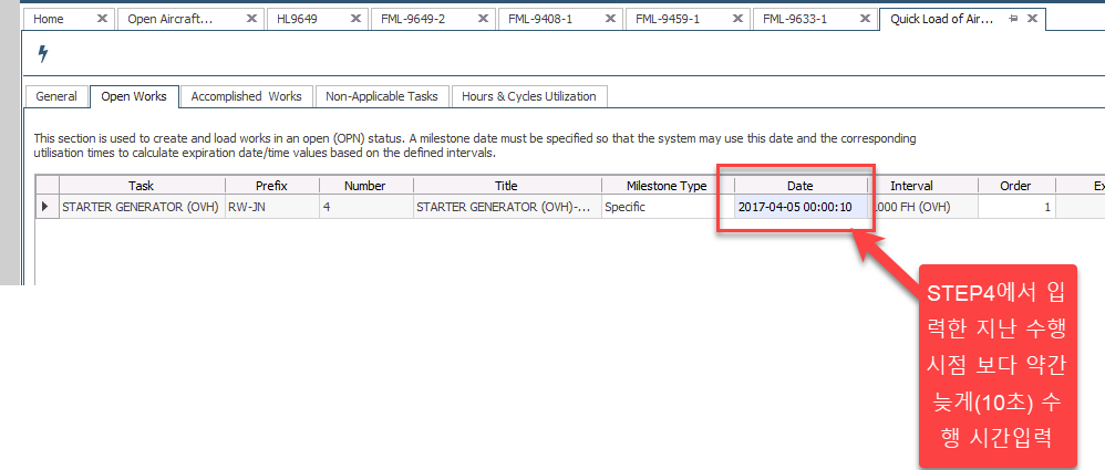 4. STEP4: HOURS & CYCLES Tab 에서 지난 수행 시점(Last Done)의 항공기 시간 및 사이클 입력