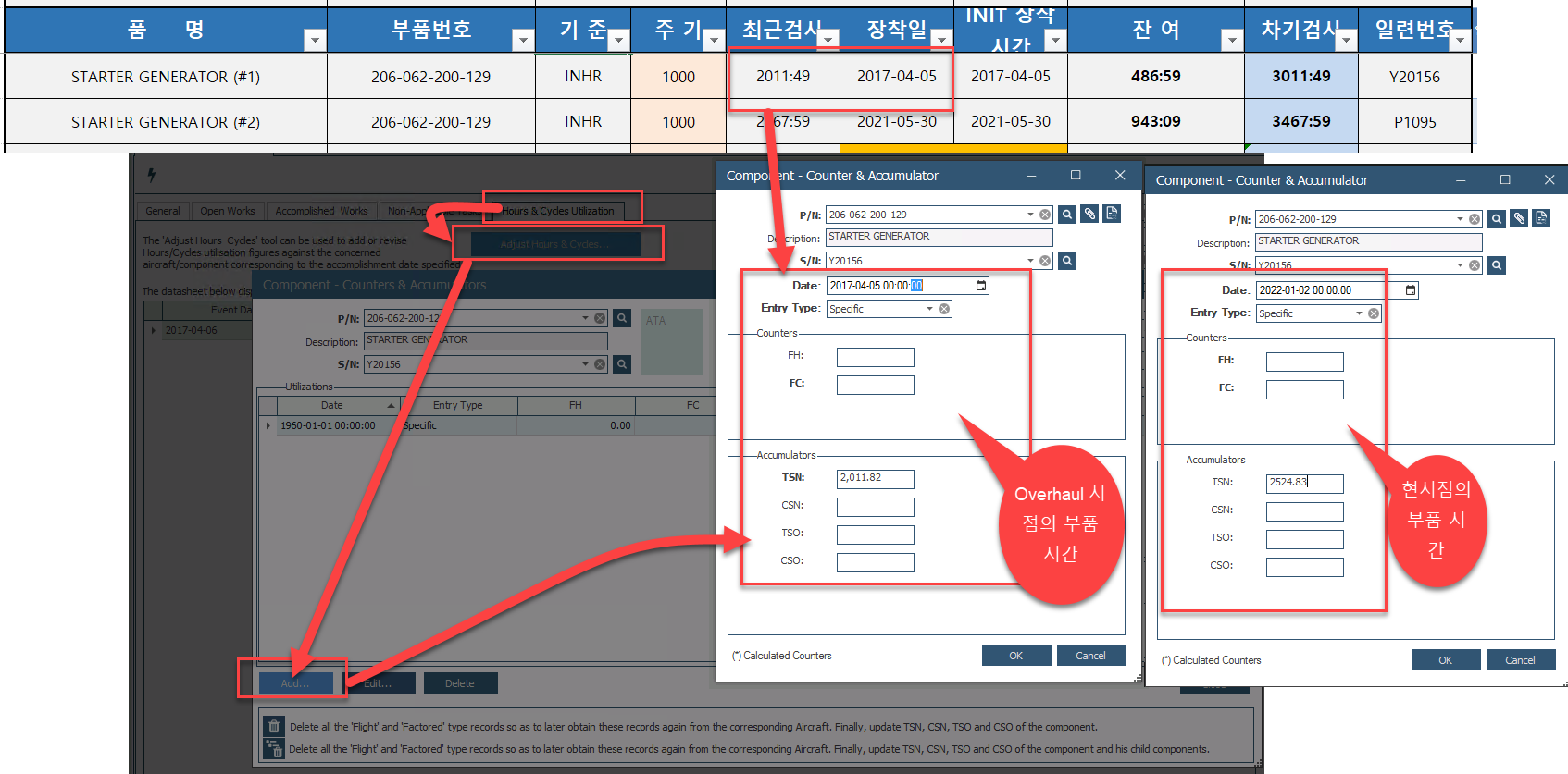 Initialization 시점(현시점)의 항공기 및 장착 부품의 시간(FH, LC 등) 및 사이클